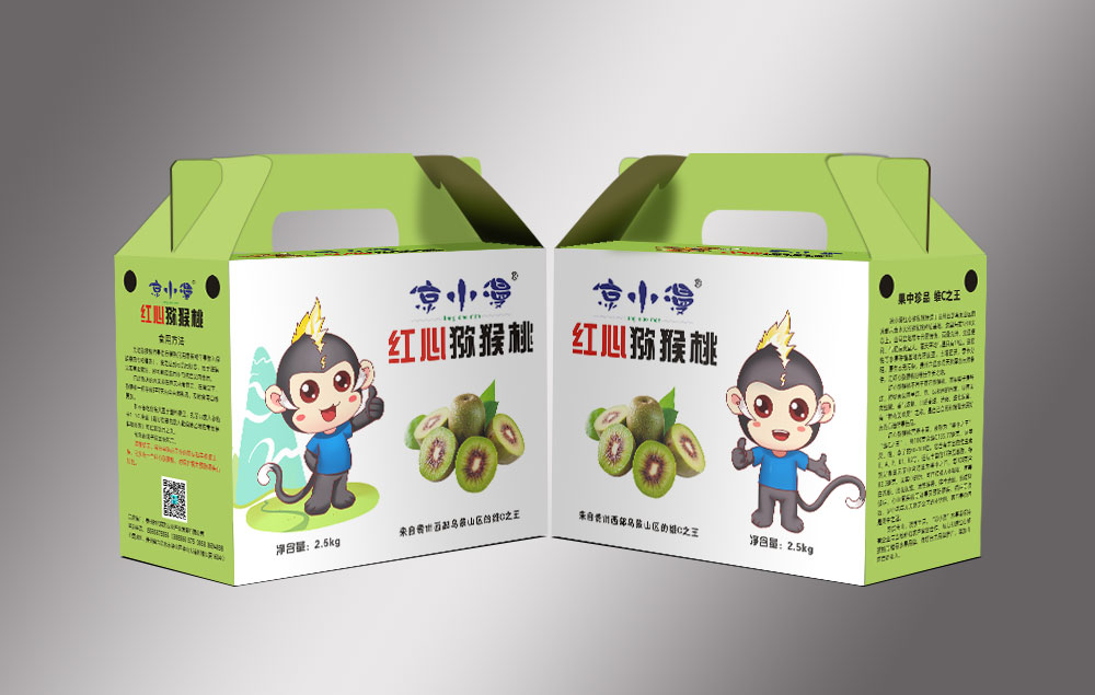 設計理念:本款包裝盒是為貴州西部烏蒙山區的天然紅心獼猴桃種植基地而定制的,整個包裝盒以獼猴桃的肉質顏色為主色調,正面以“涼小漫”紅心獼猴桃商標品牌為中心主題,正反兩面以“黑猴”為形象大使,配上紅心獼猴桃實物圖,讓消費者達到精神上的共鳴,增加了產品的理解,激發了消費者的購買欲望。
