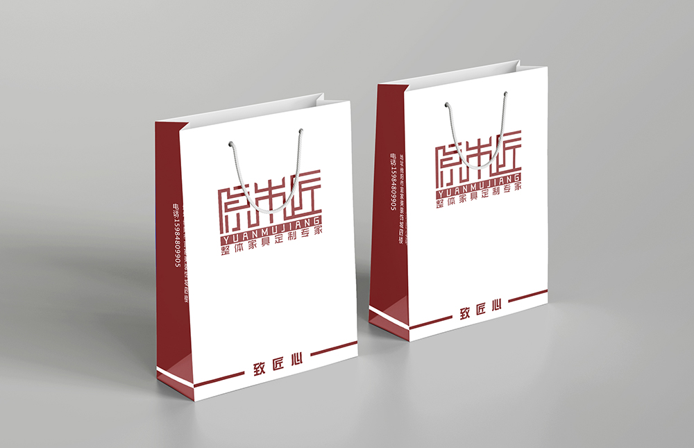 設(shè)計理念:本款家具手提袋設(shè)計以簡潔為主,以白色為主體顏色,正面以紅色logo“原木匠”突出主題,紙袋兩側(cè)邊放置公司定制、名稱、電話、二維碼等信息。