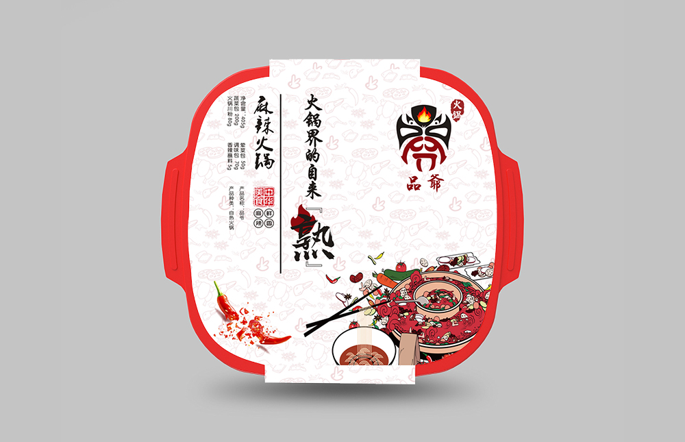 設計理念:自熱火鍋外包裝標簽設計除正面創意設計以外,其主要展示版面內容如下:1.名稱;2、凈含量;3、配料表;4、制造商;5、地址;6、網址;7、電話;8、食品生產許可證號;9、產品標準號;10、生產日期、批號;11、保質期;12、貯存條件;13、食用方法;14、食品專用發熱包;16、營養標簽;