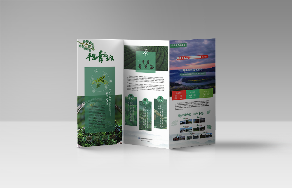設(shè)計(jì)理念:本款折頁主要是宣傳四川平昌的特色產(chǎn)品——青花椒,折頁以綠色為主,體現(xiàn)出當(dāng)?shù)靥厣a(chǎn)品的純天然、無污染。折頁正面主要介紹當(dāng)?shù)氐牡胤教厣⒉枞~、青花椒等。背面介紹了部分地方特產(chǎn),有白酒、菜籽油、青花椒醬、老臘肉、土雞蛋等特色產(chǎn)品。