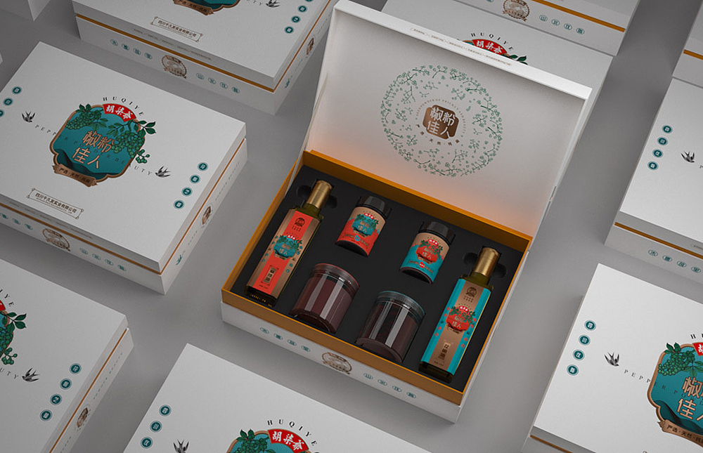 設計理念:本款包裝是一款青花椒紙盒、手提袋配套禮盒,包裝色彩提取青花椒的綠色為主色調,包裝設計風格采用中國風的水墨文字設計,配上古代熱鬧、繁華的街景圖案,呈現出一種歡快、祥和的景象,給消費者帶來一種愉快的購物心情。