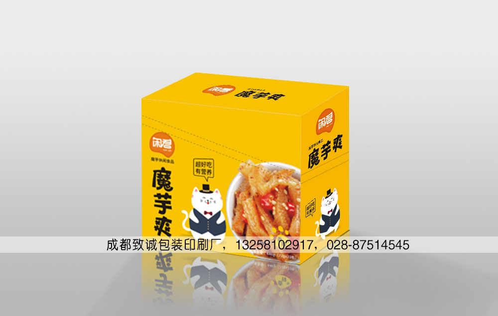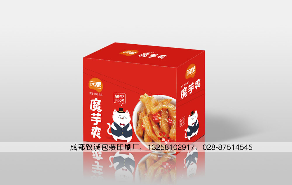 素毛肚又名魔芋爽,因其是用魔芋粉制成而得名;魔芋爽既有毛肚的爽脆口感、又有素菜的美容瘦身功能,所以受到廣大好吃嘴的喜愛,在超市的零食區總是能看到素毛肚整齊的擺放在貨架上,有的是一袋袋的,也有的是一盒盒的,我公司專業為各大廠家定制生產各類食品紙盒,也包括素毛肚包裝盒,如下面這款: